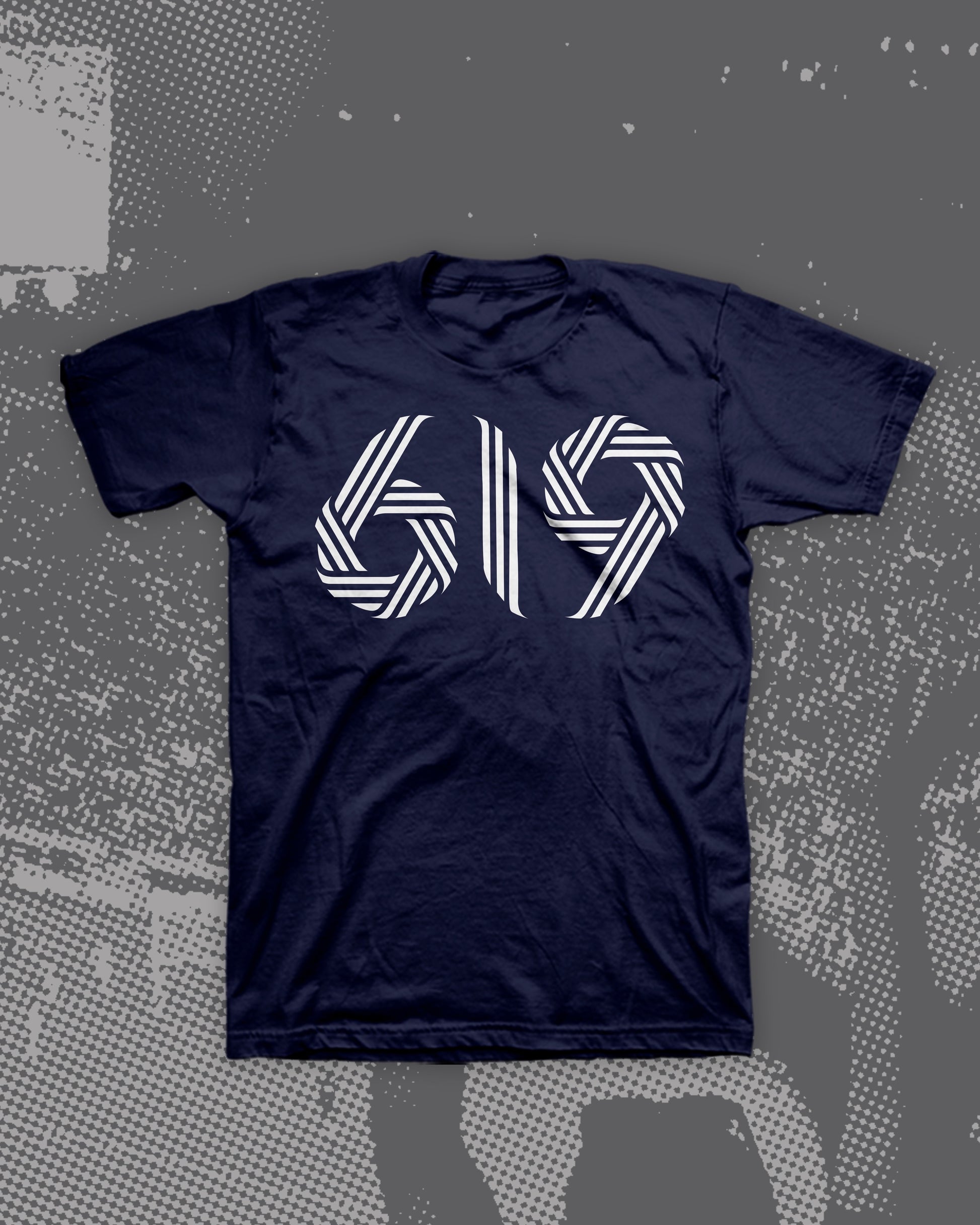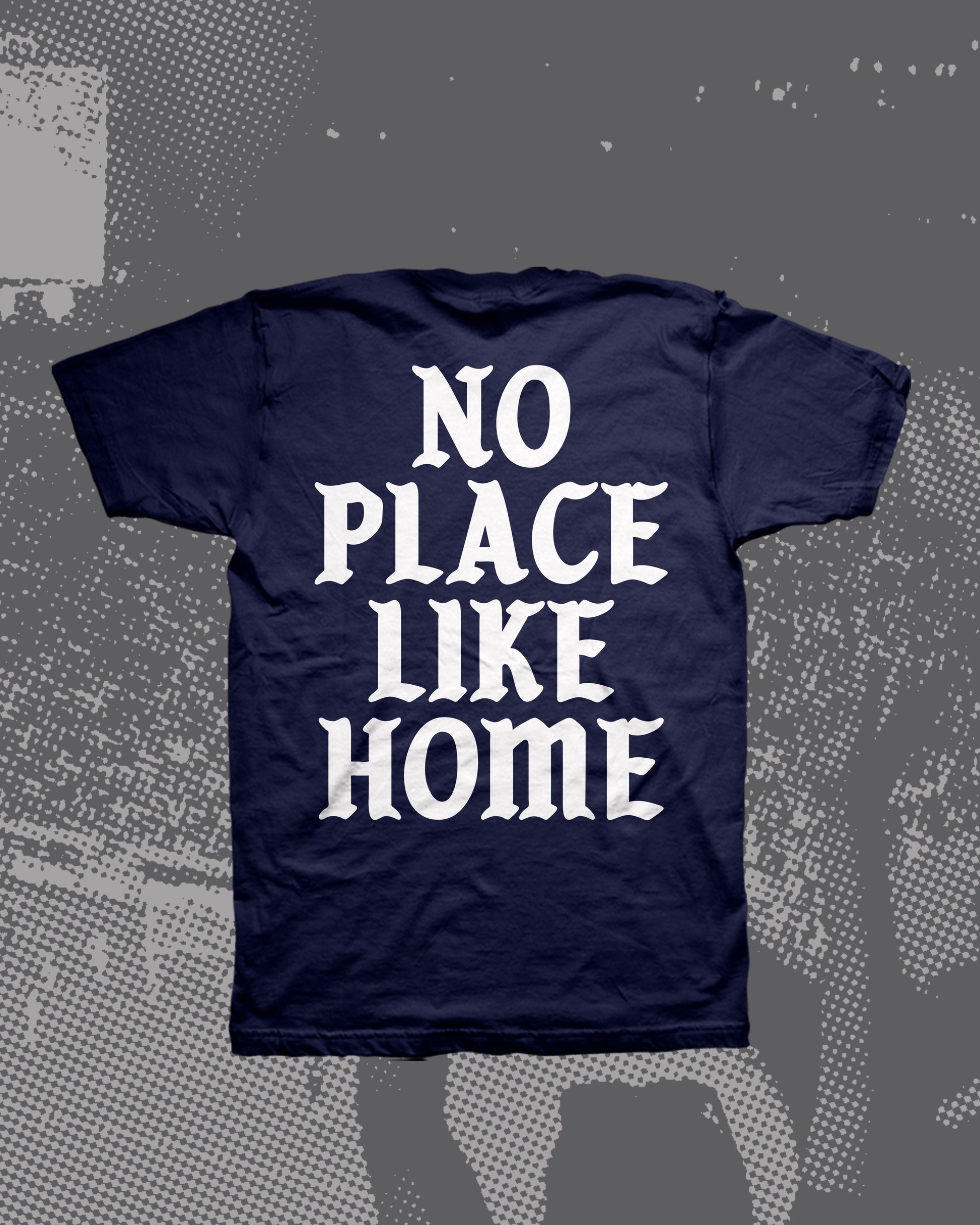 Navy blue tee with white print. 6 oz., ring-spun combed cotton, heavy weight t-shirt with 1" collar